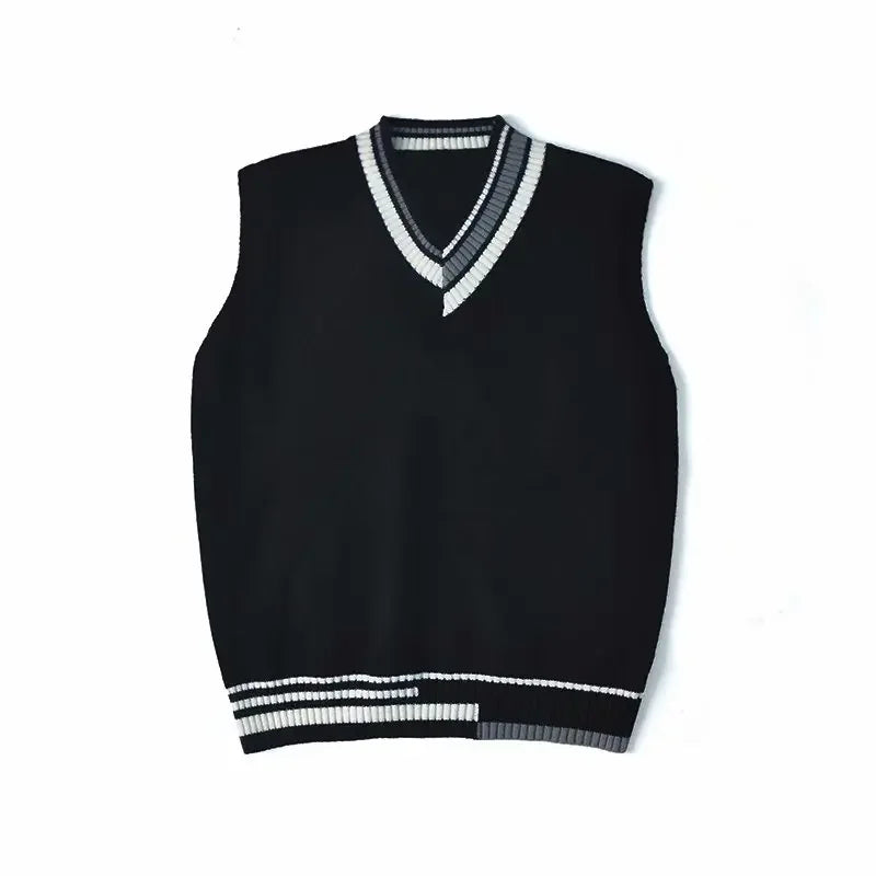 WIAOFELLAS - Men Sweater Vest Patchwork Simple Panelled Sleeveless Knit Sweaters Male Loose V-neck All-match Korean Preppy Style Streetwear