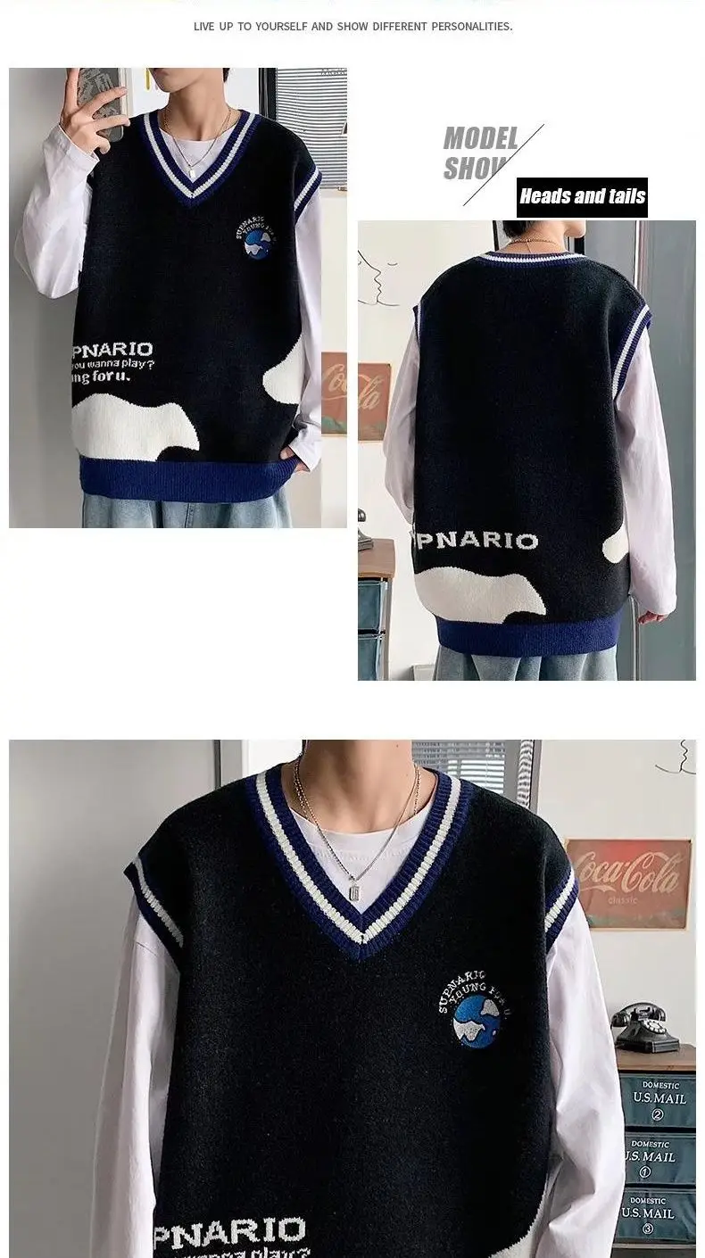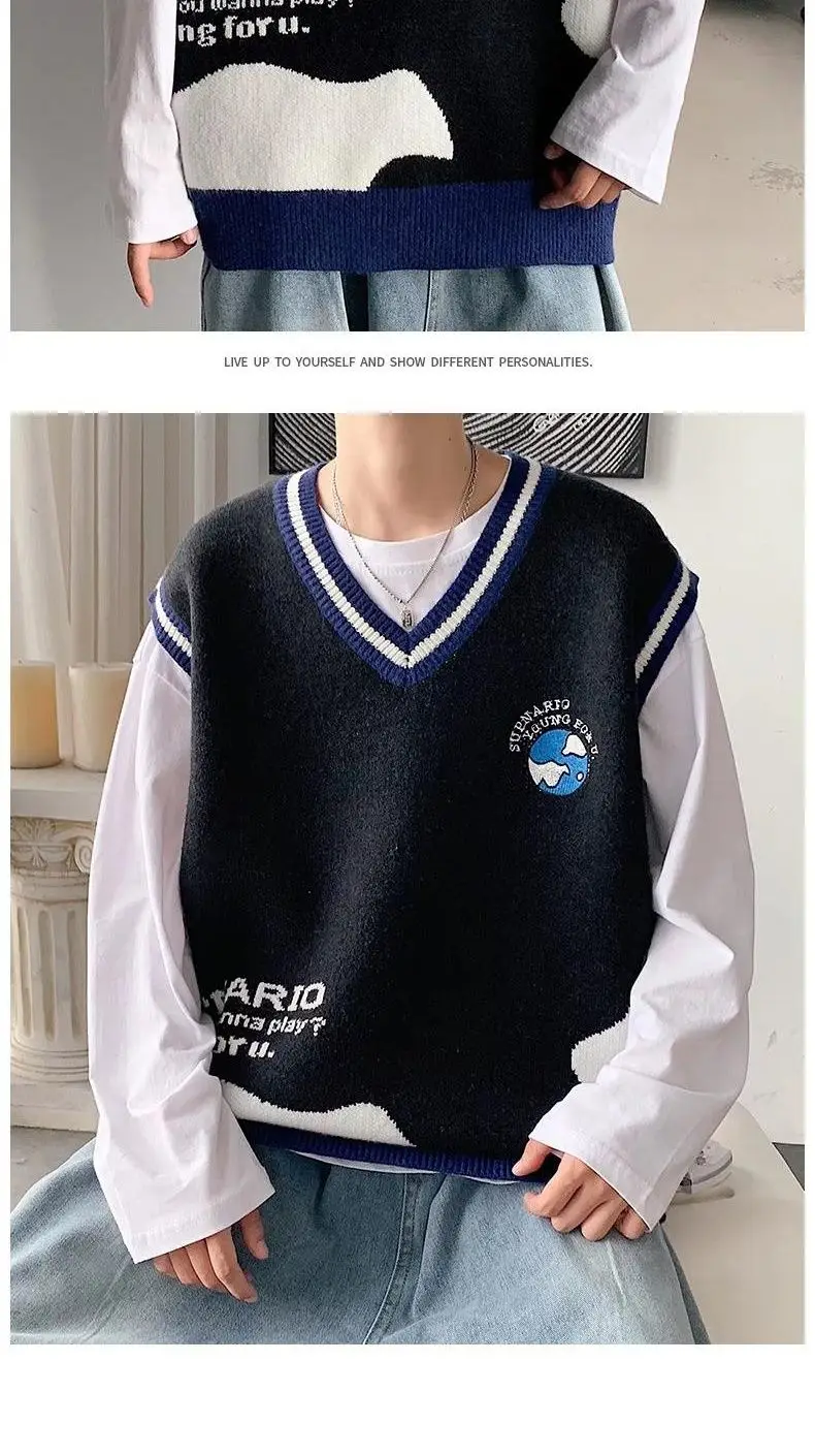 Wiaofellas Men's Sweater V-neck Vest Korean Version Sweater Harajuku Style Vest Sleeveless Loose Vest