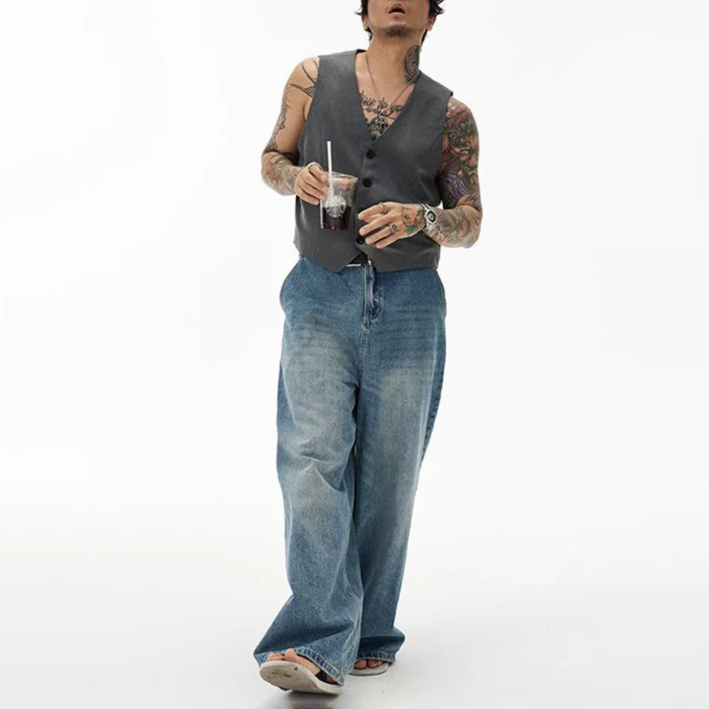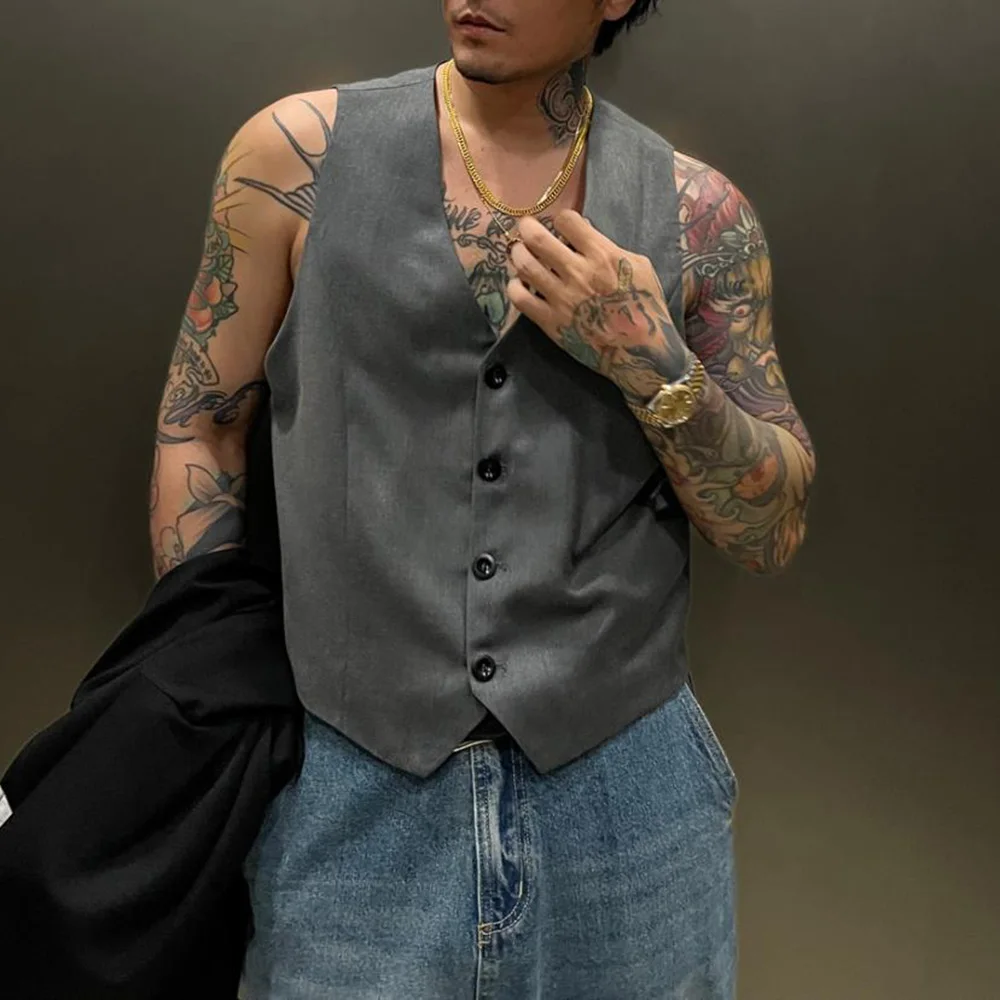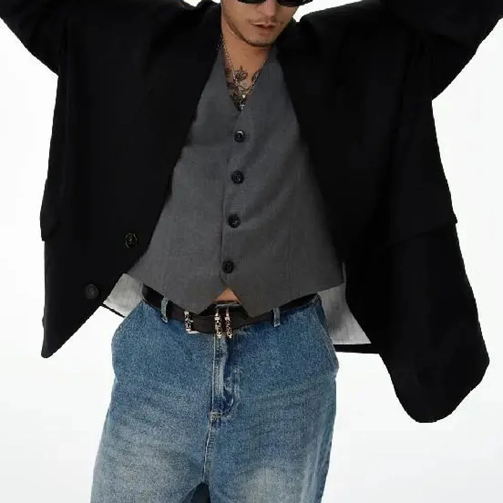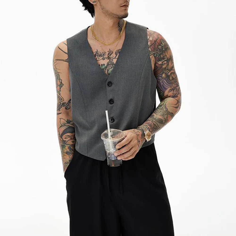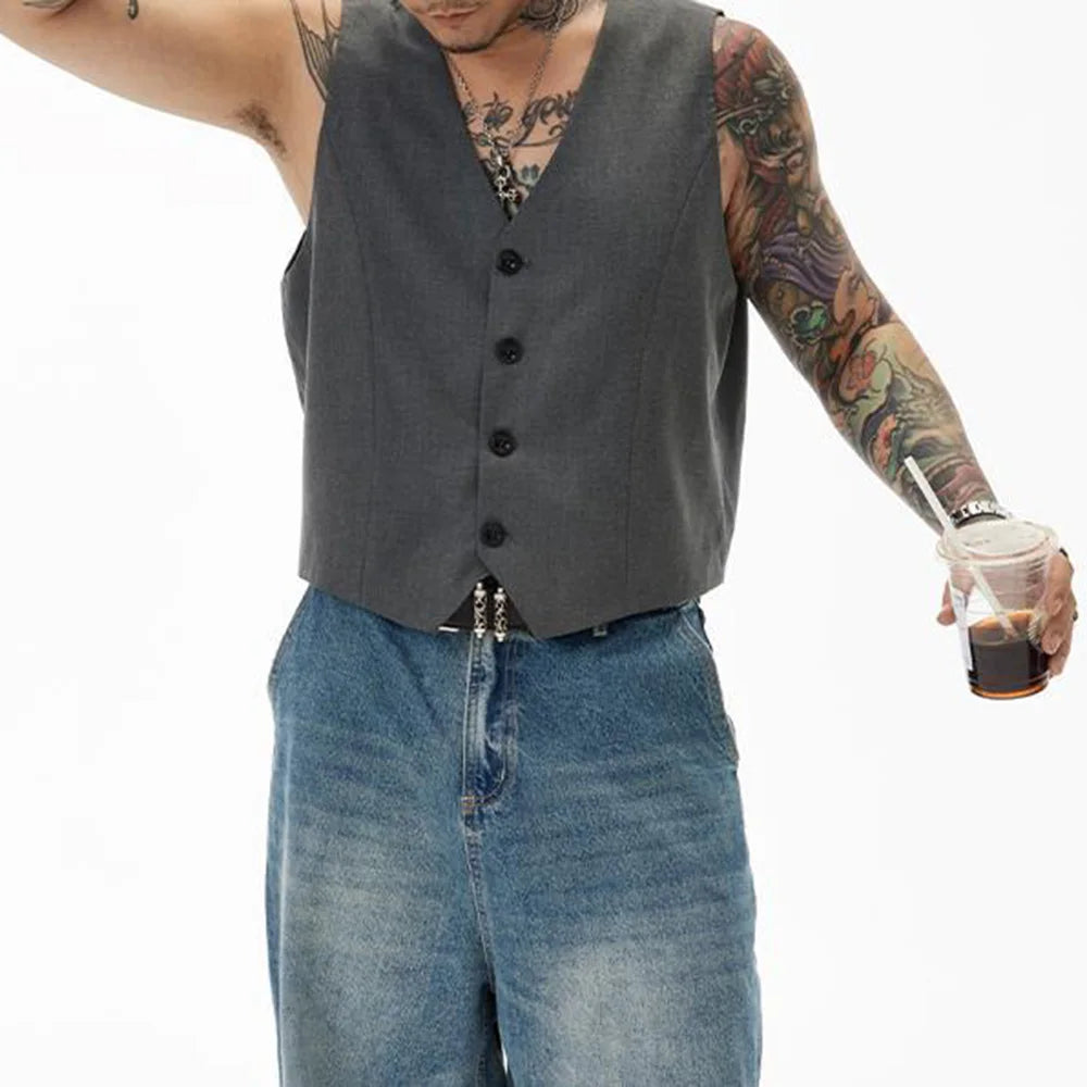 WIAOFELLAS - Mens Vest Sleeveless Retro Urban Layering Piece Suit Vest Slim Fit Vintage Essential Gray Waistcoat Trendy Button Unisex Vest