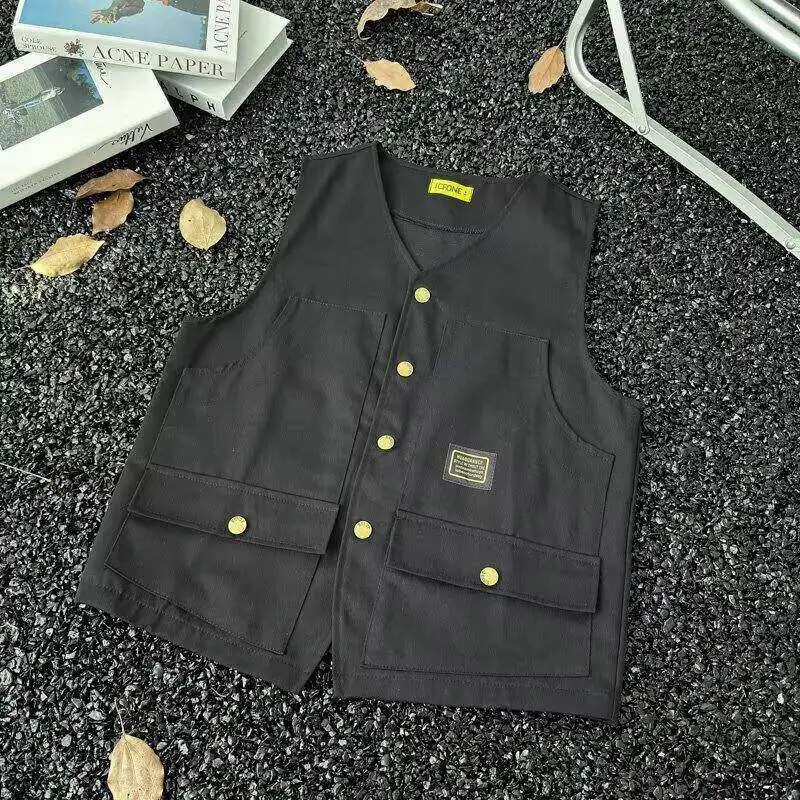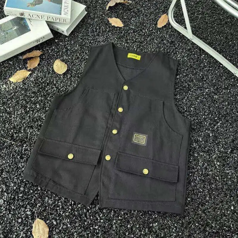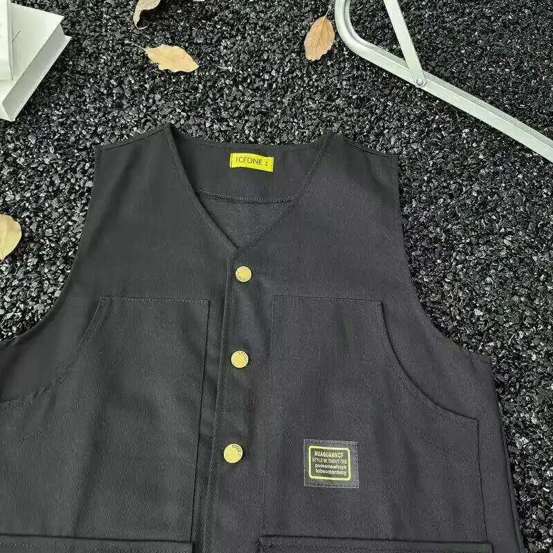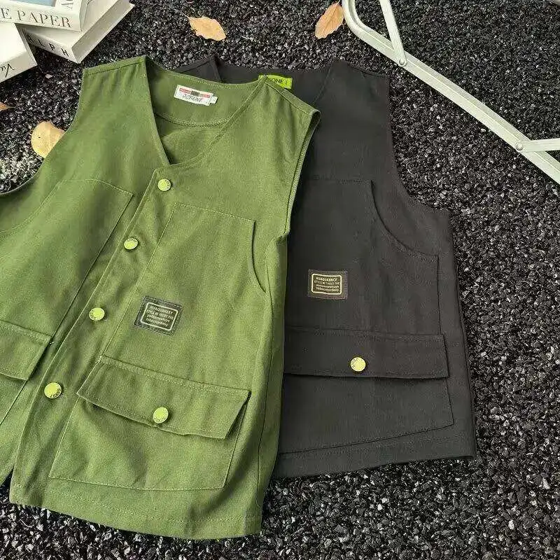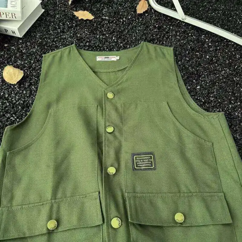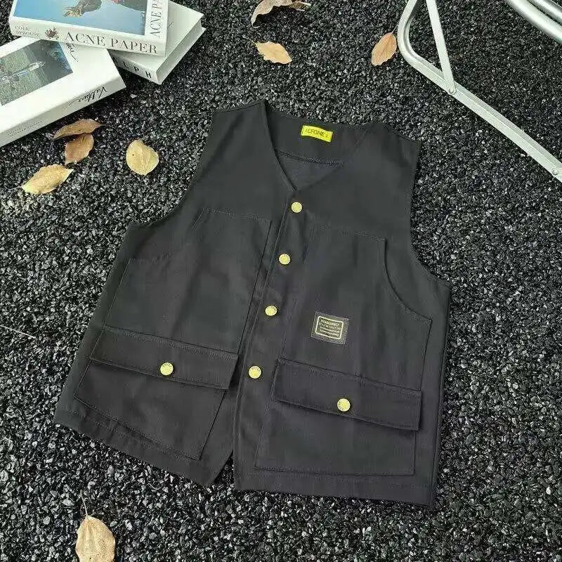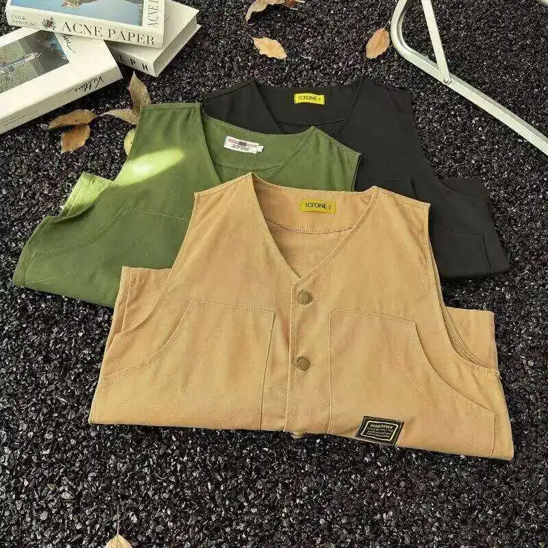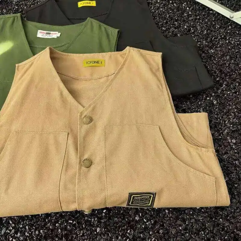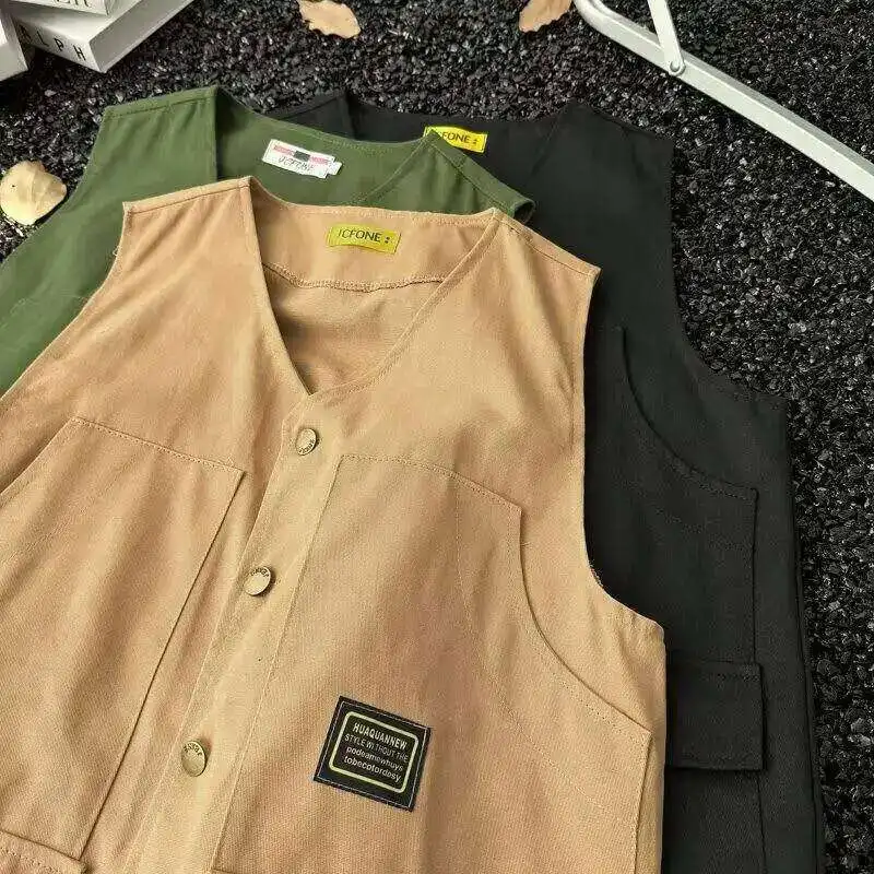 WIAOFELLAS - V-neck Men's Tank Tops Single Breasted Solid Color Sleeveless Casual Menswear Loose Pocket Malek Vests Summer