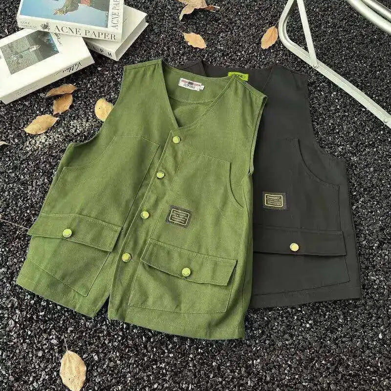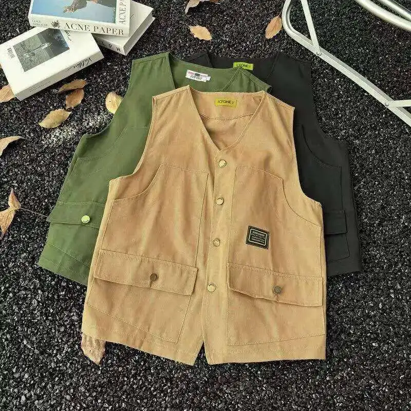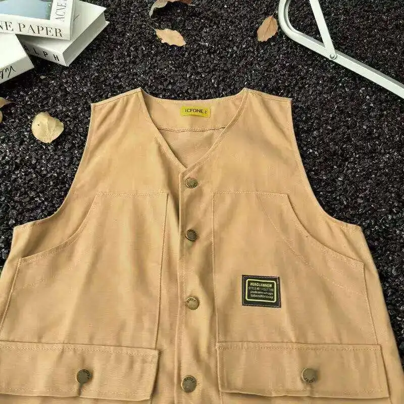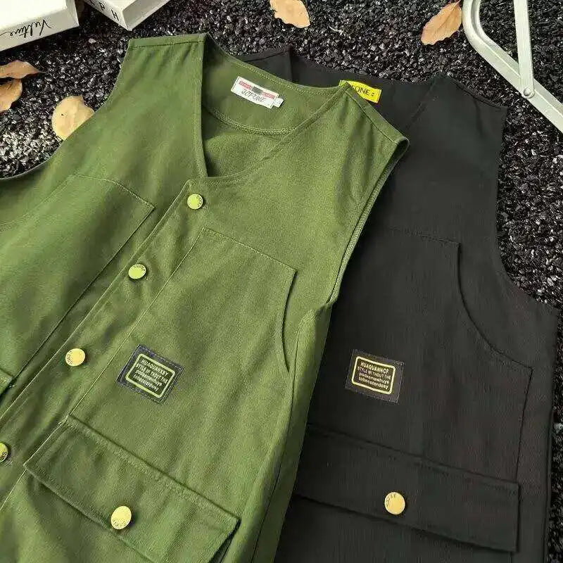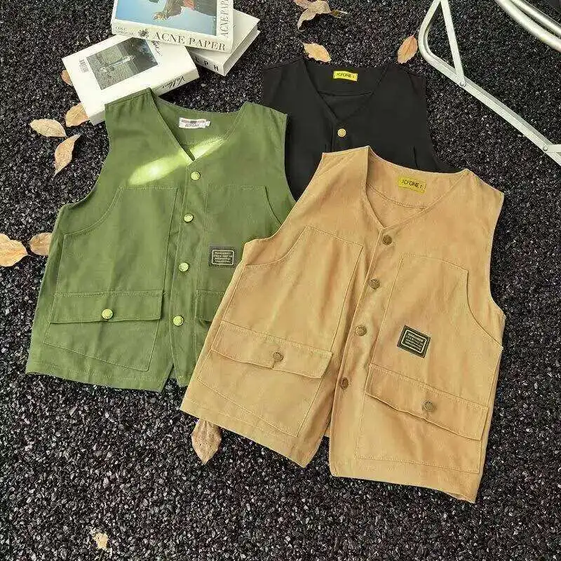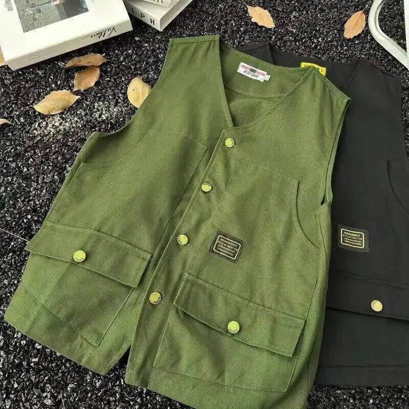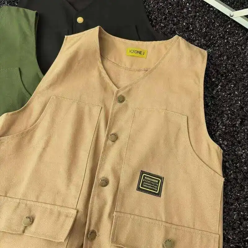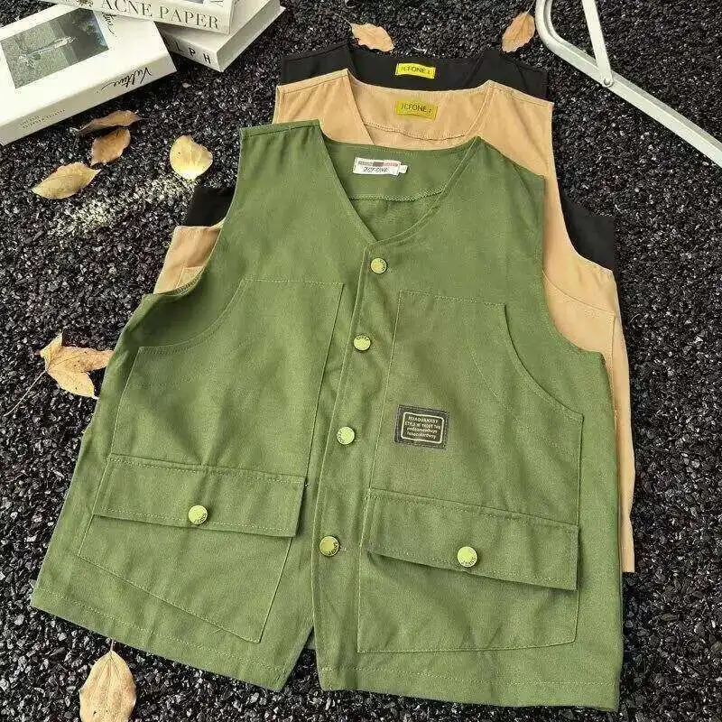 WIAOFELLAS - V-neck Men's Tank Tops Single Breasted Solid Color Sleeveless Casual Menswear Loose Pocket Malek Vests Summer