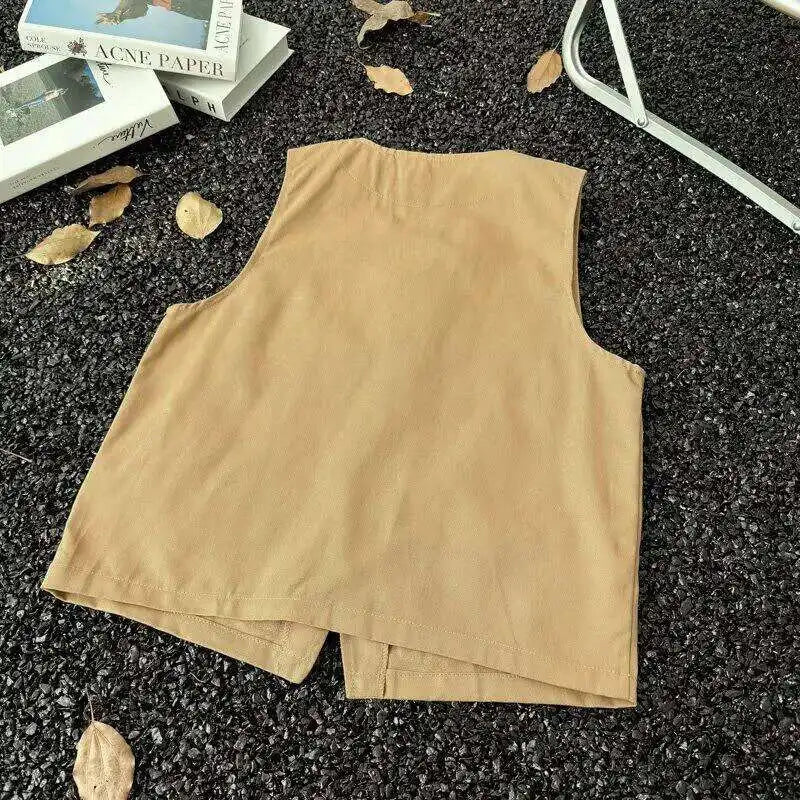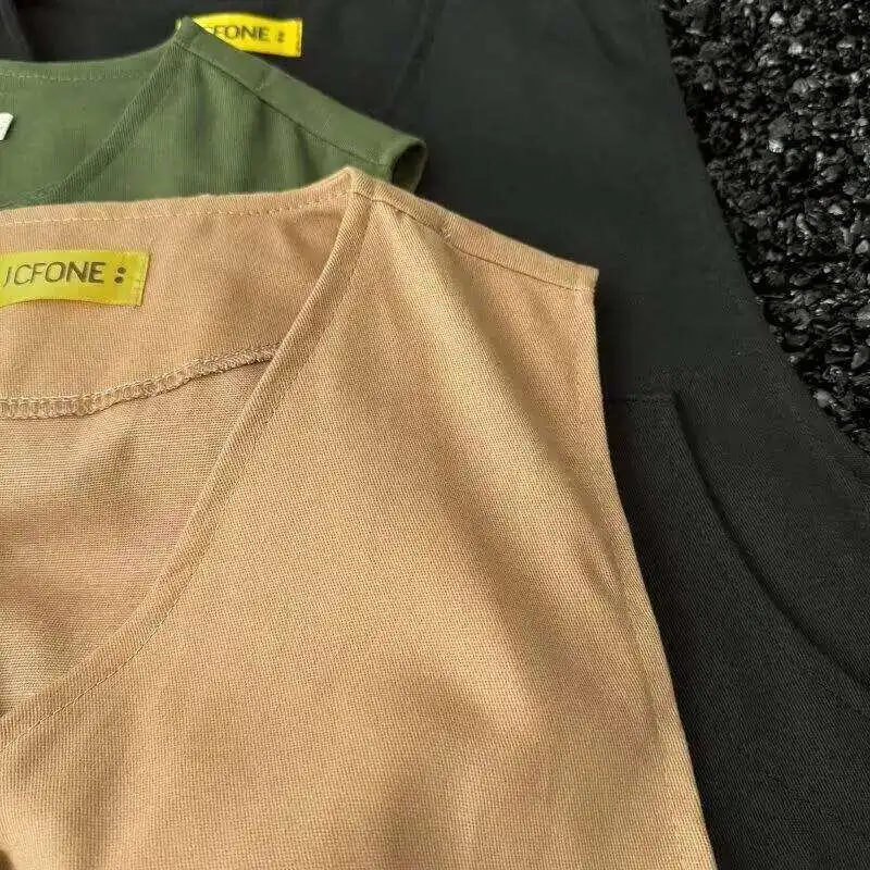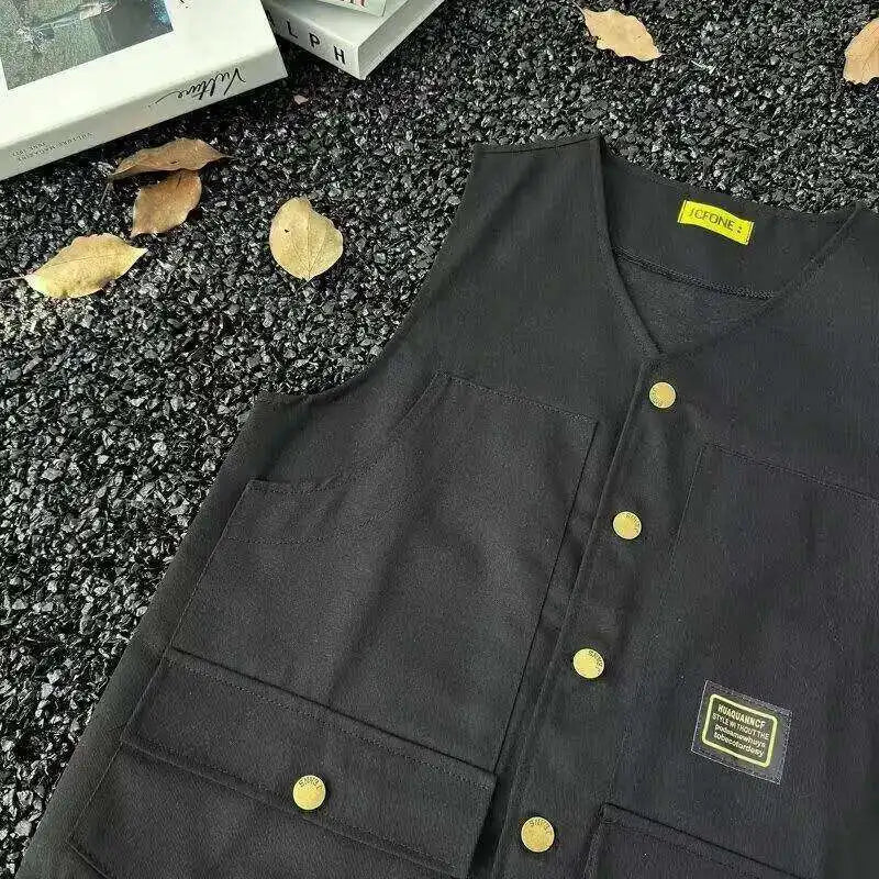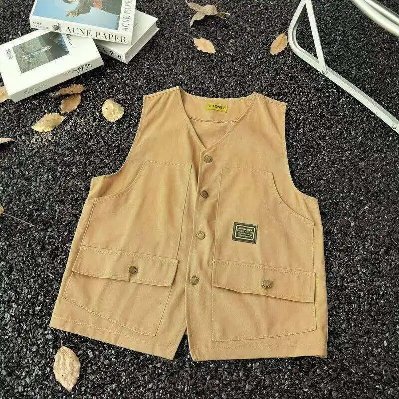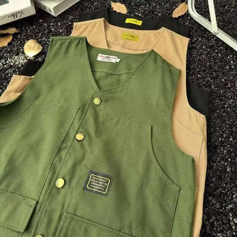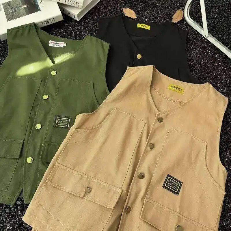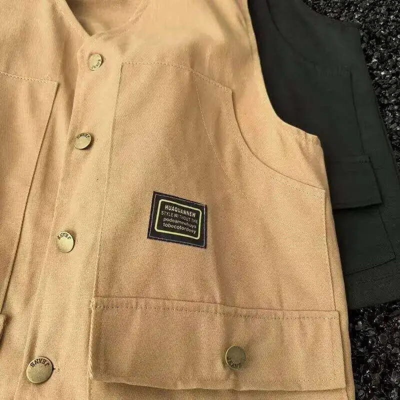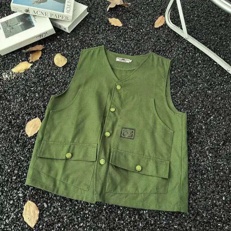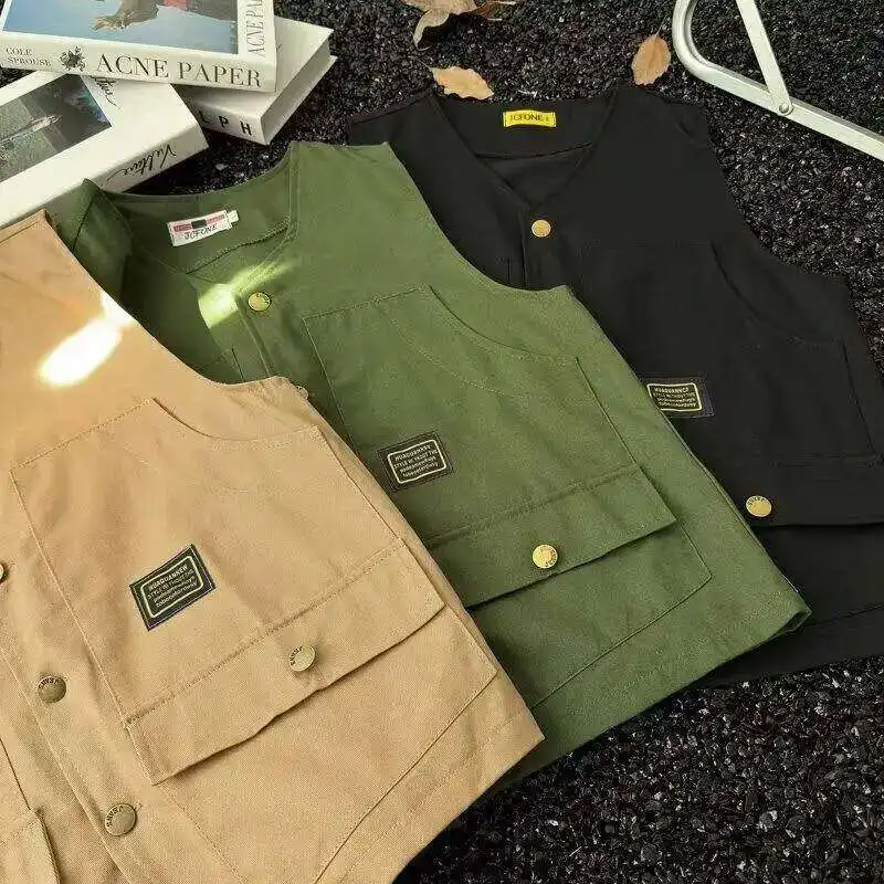 WIAOFELLAS - V-neck Men's Tank Tops Single Breasted Solid Color Sleeveless Casual Menswear Loose Pocket Malek Vests Summer