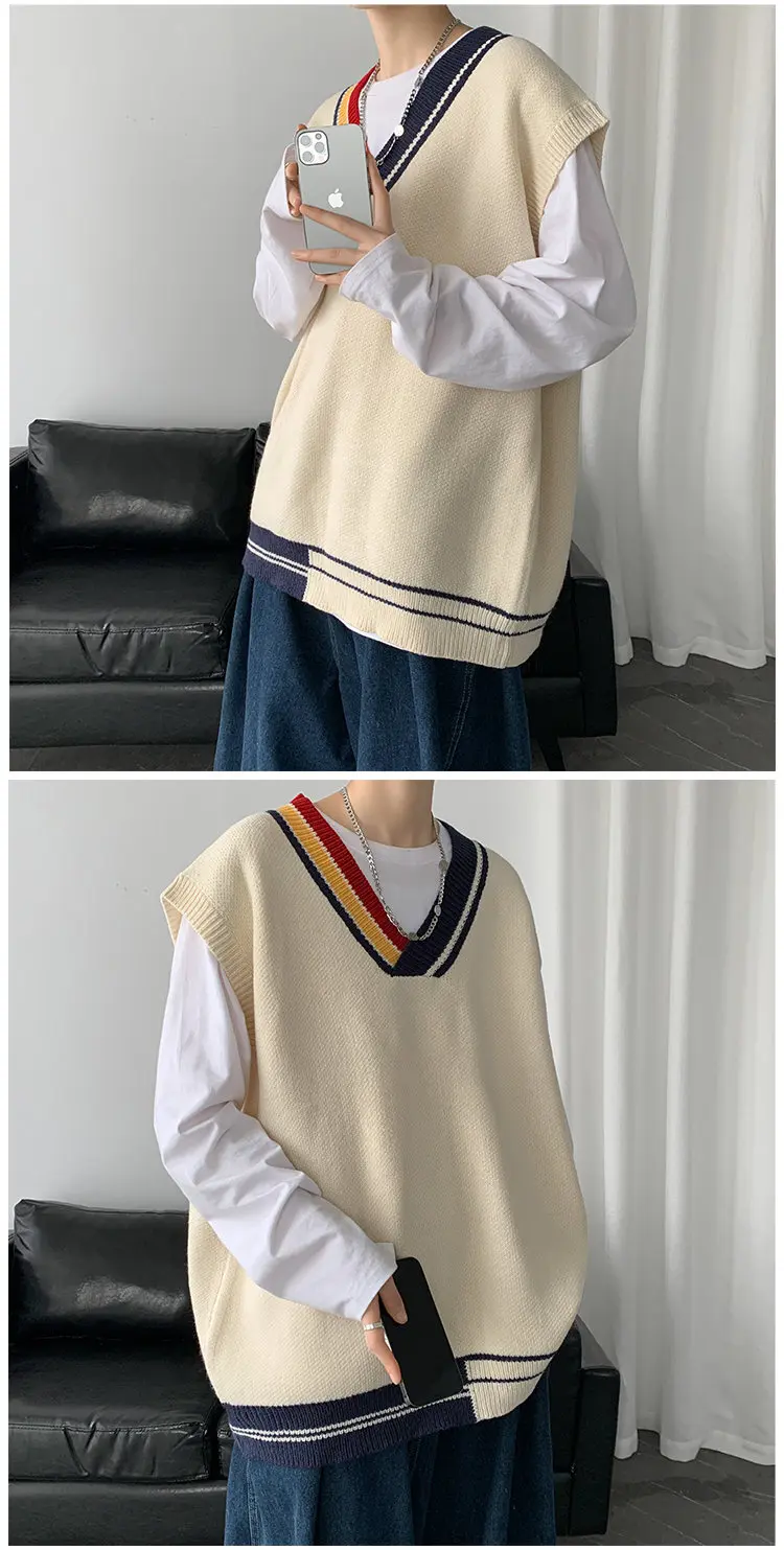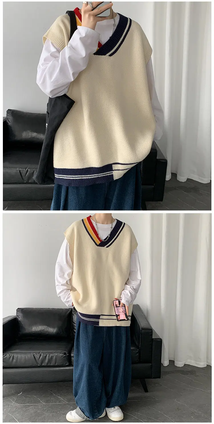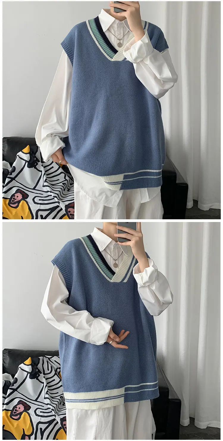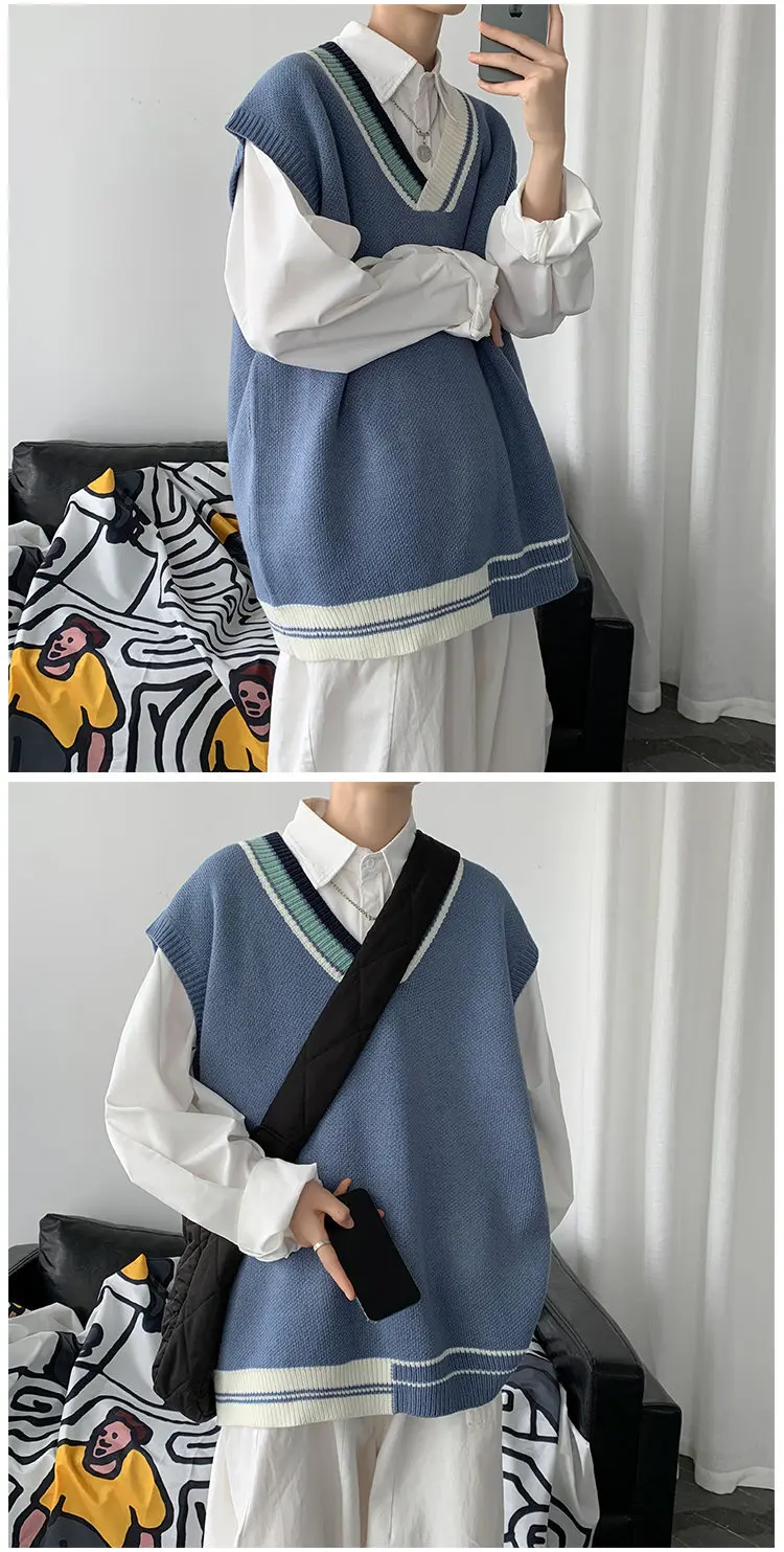 Wiaofellas  -  Winter Sweater Vest Men Warm Casual Knitted Pullover Men Oversized Korean Loose Sleeveless Sweater Mens V-neck Sweater Vest