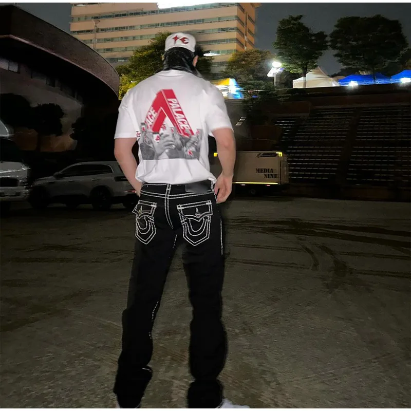 Wiaofellas - American Style High Street Trendy White Lines Jeans Men's Spring Autumn Pocket Zipper Straight Leg Casual Loose Denim Pants