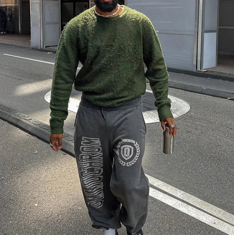 Wiaofellas - fall outfits Mohair Solid Knit Sweater Autumn Winter New Men's High Street Casual Warm Pullover Fashion O-neck Large Size Loose Knitwear