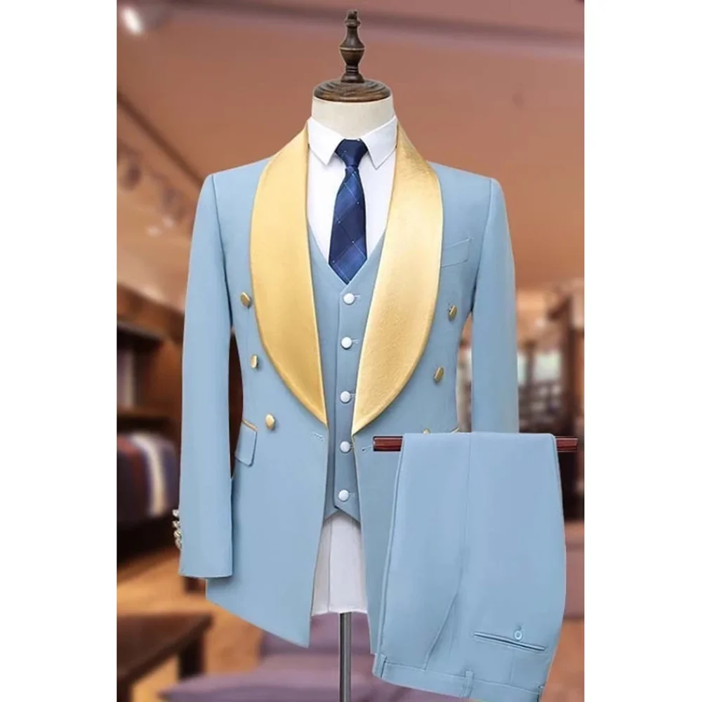 Wiaofellas - Fashion Suits for Men 3 Piece Elegant Satin Shawl Lapel Male Suit Slim Fit Double Breasted Party Wedding Groom Tuxedo